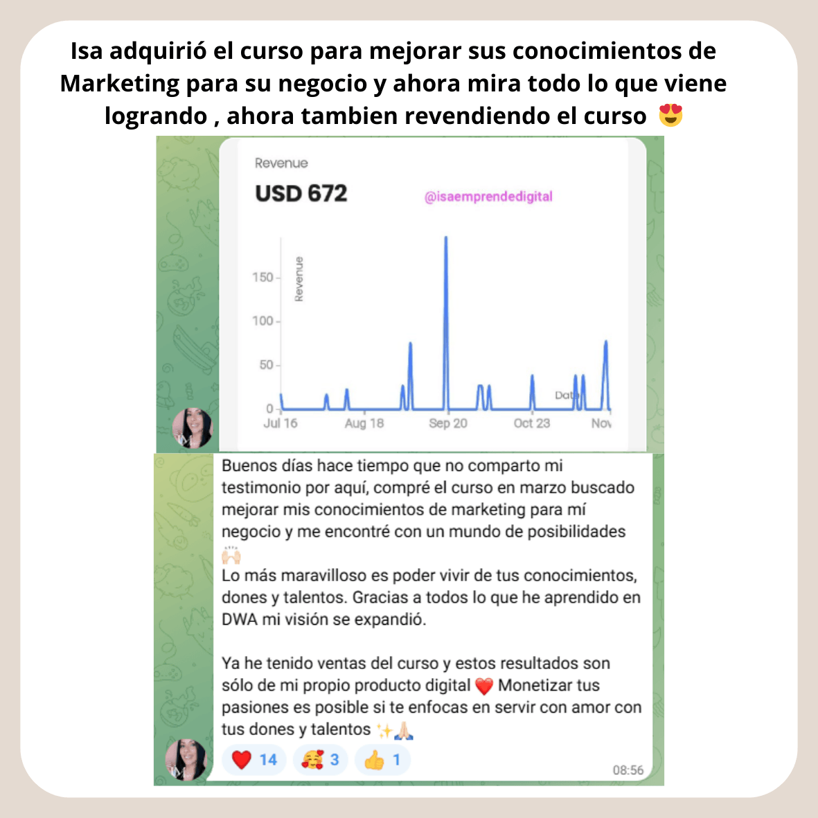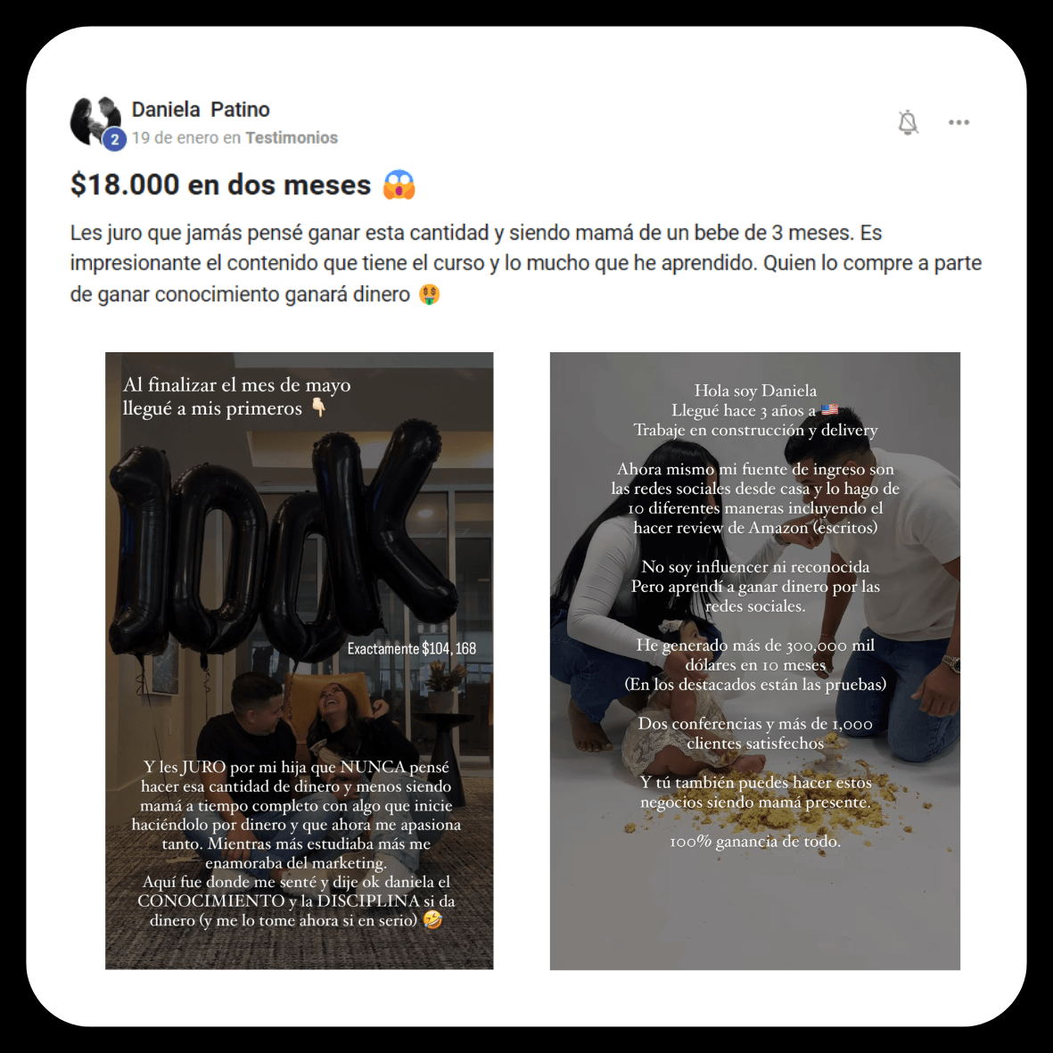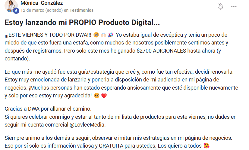 Daniela Patiño comenzó con el programa DWA justo después de dar a luz y atravesando una depresión posparto. Una de las razones por las que decidió empezar fue por que no quería depender económicamente de su esposo, ya que en ese momento no podía salir a trabajar. Al principio compartió emocionada con la comunidad cómo logró ganar $18,000 en sólo dos meses. Ahora más de 10 meses después, ha generado más de $300,000 y, además gracias a lo aprendido, abrió su propia agencia de marketing. 👇