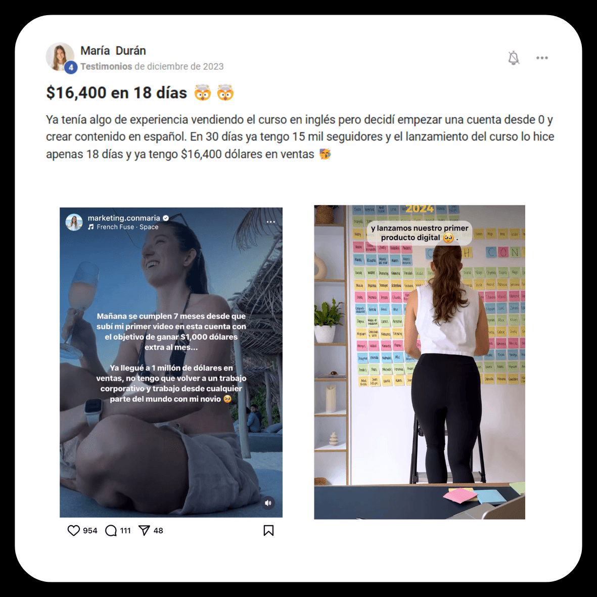 Conoce a María Durán. Ella decidió entrar al mundo del marketing digital porque quería dejar su trabajo como asistente virtual, donde trabajaba más de 10 horas al día. Comenzó con el programa DWA y, en solo 7 meses, logró ganar su primer millón de dólares mientras construía una gran comunidad. Hoy, gracias a lo aprendido en el programa, ya lanzó su primer producto digital.👇